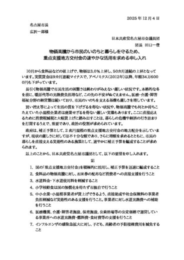 「学校給食の無償化を求める」請願の審議では、自民議員から「722自治体(約4割)が無償化し、うち547自治体は小中学校で無償化している。国も令和8年度実施と示している。国が進めれば名古屋市も検討するように」と発言ありました。