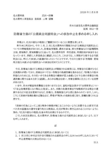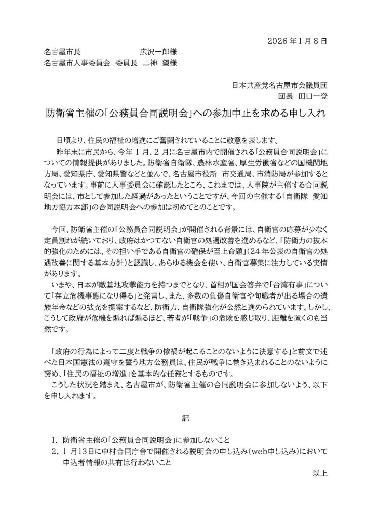 昨年末に市民から、今年1月、2月に名古屋市内で開催される「公務員合同説明会」についての情報提供がありました。共産党名古屋市議団は、1月8日、人事委員会と名古屋市長に、名古屋市が、防衛省主催の合同説明会に参加しないよう申し入れました。