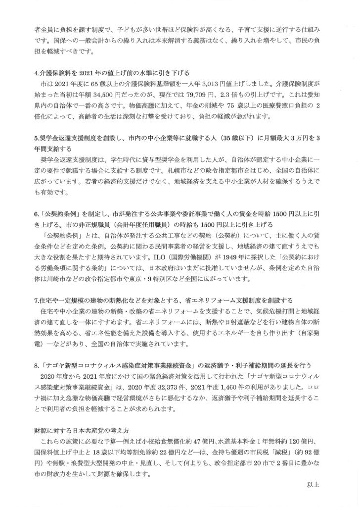 これらの施策に必要な予算―例えば小校給食無償化約47億円、水道基本料金1年無料約120億円、国保料値上げ中止と18歳以下均等割免除約22億円など―は、金持ち優遇の市民税「減税」(約92億円)や無駄・浪費型大型開発の中止・見直し、そして何よりも、政令指定都市20市で2番目に豊かな市の財政力を生かして財源を確保します。