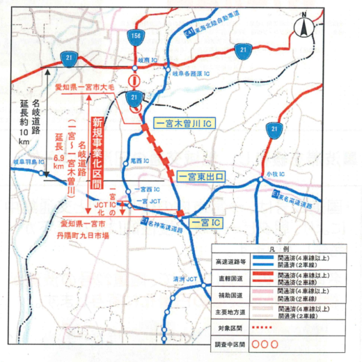 名岐道路のうち一宮インターから一宮木曽川インターまでの区間が事業化され、国との合併施行として、有料道路については公社が施行するとされています。